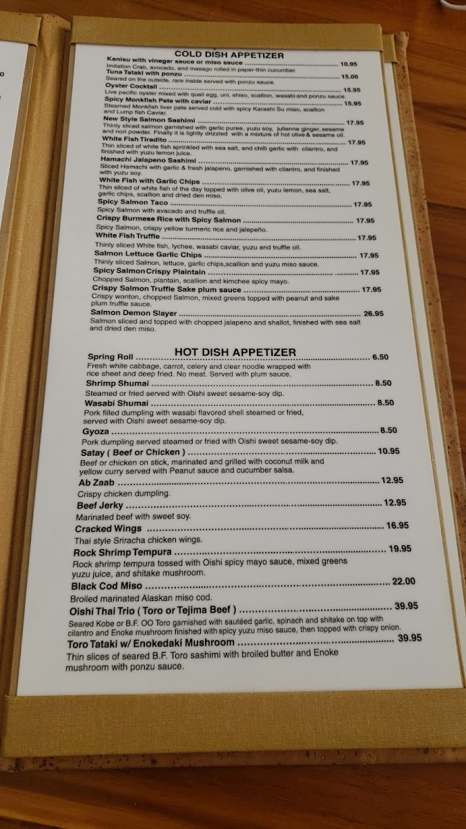 (Toro or Tejima Beef). Seared Kobe or B.F. OO Toro garnished with sautéed garlic, spinach and shitake on top with cilantro and Enoke mushroom finished with spicy yuzu miso sauce, then topped with crispy onion